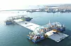 In Rødbyhavn liegen die Elemente bereit. Die intensivsten Arbeiten konzentrieren sich derzeit auf den Arbeitshafen rund um das Absenkschiff Ivy, unter dem das erste Tunnelelement bereits positioniert ist. Rund um Ivy liegen die übrigen fertig gegossenen Elemente und warten auf ihren Einsatz.